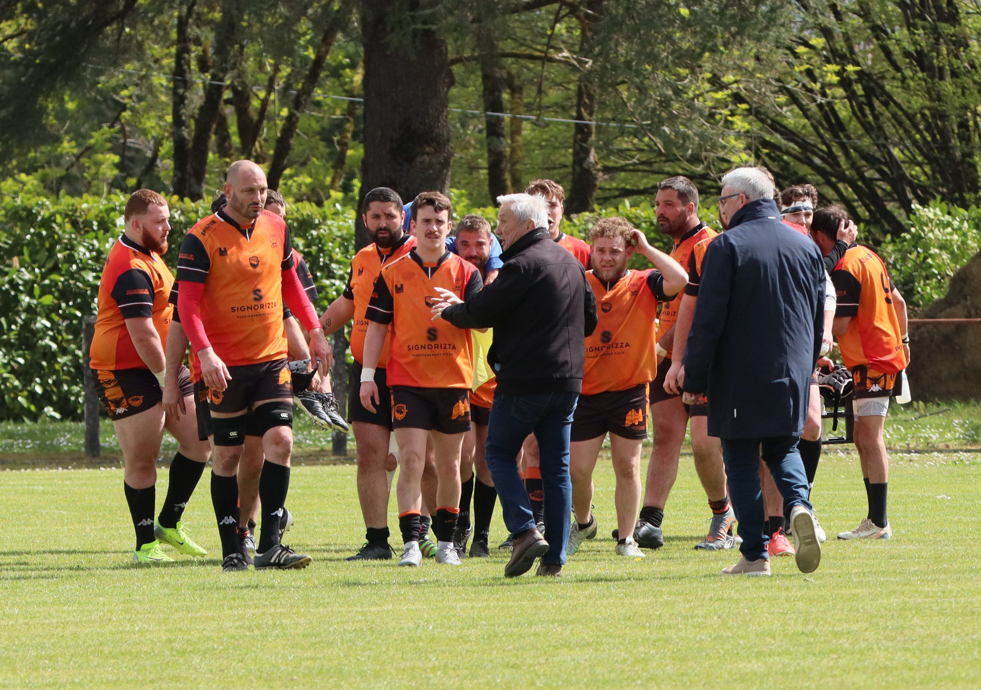Malgré ce contexte compliqué, les Oranges et Noirs font preuve d’abnégation et parviennent à réagir grâce à un essai d’Anthony Baldo, permettant de maintenir un espoir (21 – 7, 25e). Mais les locaux poursuivent leur domination et inscrivent un quatrième essai avant la pause pour porter le score à 28 – 7 à la mi-temps.