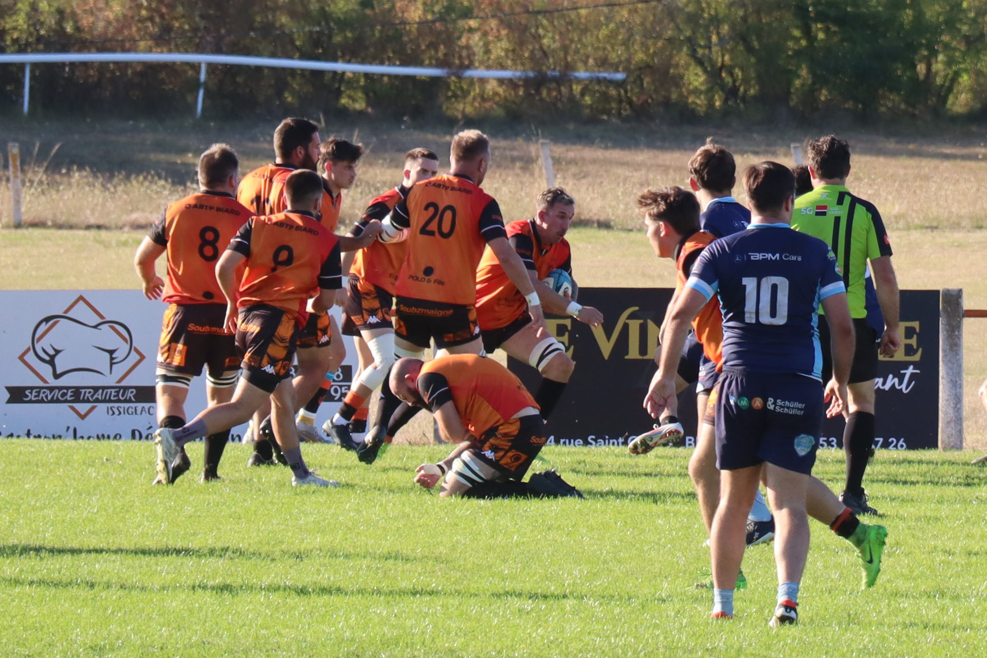Dès la première période, le public a pu découvrir une première ligne totalement inédite avec les recrues Florian Lescadieu (pilier gauche), Younes Campergue (talonneur) et Emiliano Racca (pilier droit). Portés par ce pack remanié, mais solide, les Issigeacois ont su imposer leur rythme et virer en tête à la pause grâce à deux essais contre un seul encaissé (14–7). À l’ouverture, Marc Moulinier a assuré le relais de Matthew Farmer et s’est distingué par la justesse de son jeu au pied, transformant notamment le premier essai marqué en coin.