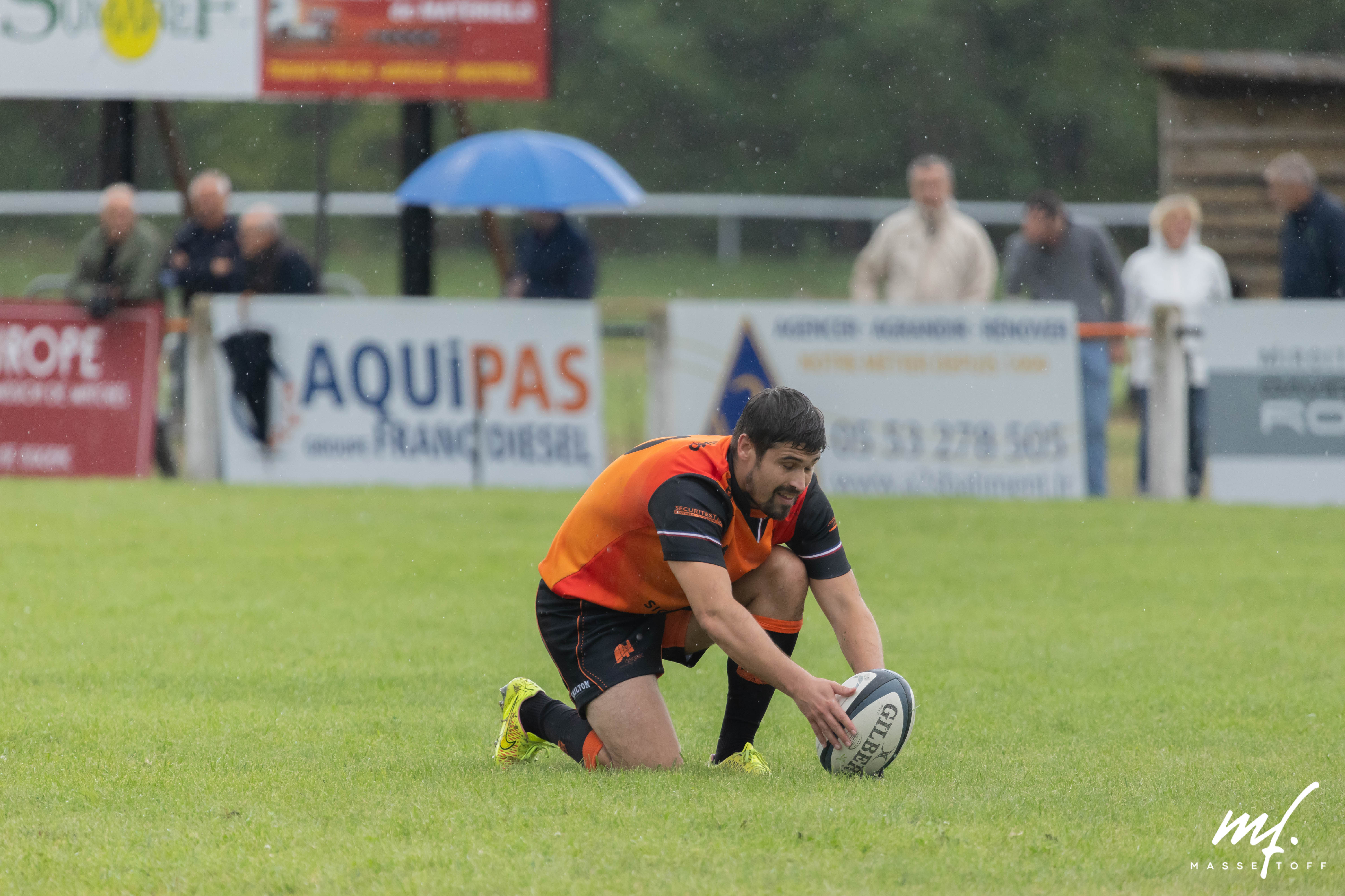 Ribérac : 2 essais des n°5 (45e), et n°2 (69e). 2 transformations du n°10 (45e, 69e). 1 pénalité du n°10 (40e).