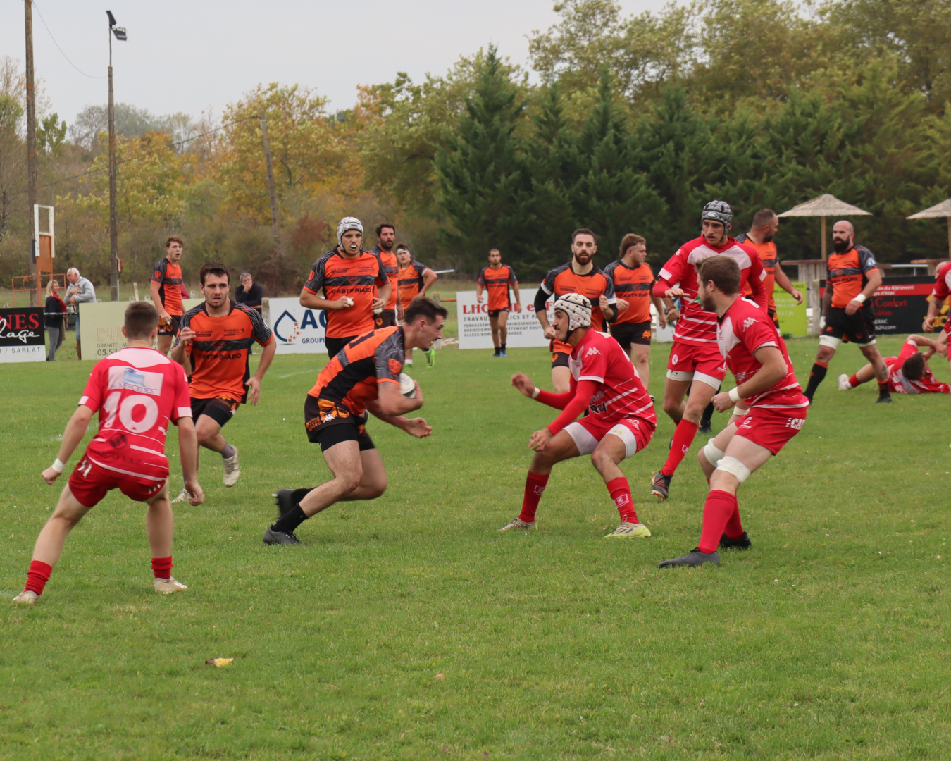 Les visiteurs repartent fort et creusent l’écart dès la reprise (3 – 17, 42ᵉ).Issigeac réagit avec un bel essai de Gabin Bonnet en puissance sur ballon porté (10 – 17, 48ᵉ).Mais une faute défensive dans les cinq mètres offre un essai de pénalité à Villeneuve, tandis que Bonnet écope d’un jaune. En infériorité numérique, les Oranges et Noirs encaissent un nouvel essai (10 – 31, 53ᵉ).Fidèles à leur état d’esprit, les Issigeacois repartent de l’avant. Profitant d’un double carton adverse, ils reviennent grâce à Gabin Bonnet (63ᵉ) puis Clément Manière (70ᵉ) sur deux nouveaux ballons portés bien structurés (24 – 31).Mais la fatigue se fait sentir et les Landais enfoncent le clou en toute fin de rencontre (24 – 38).
